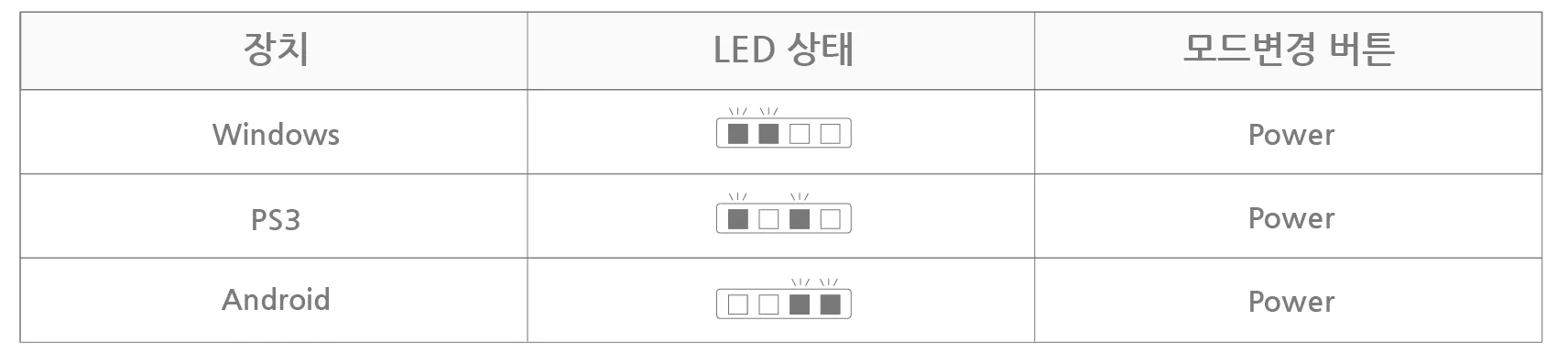 전원 켜기 : USB를 장치에 연결합니다.'전원 버튼'을 눌러서 위의 표에 따라 모드를 변경하십시오.