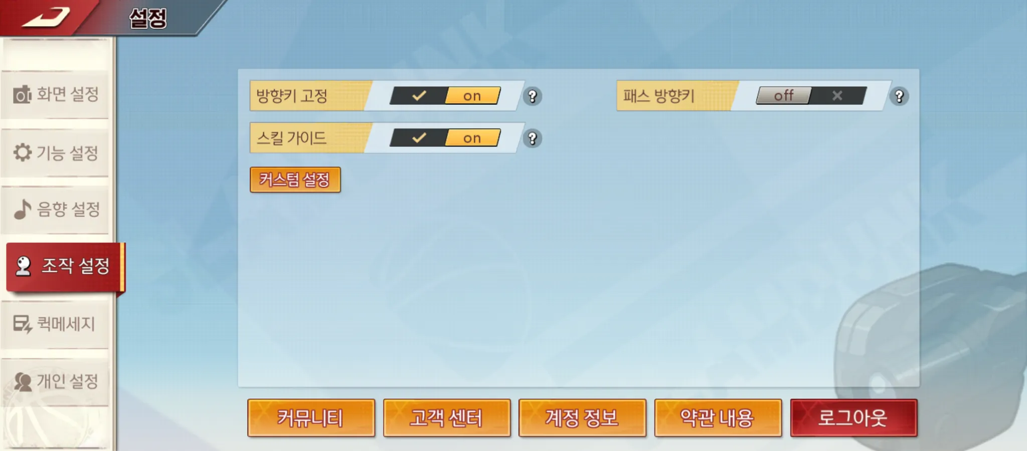 게임 내 설정 → 조작 설정 → 방향키 고정 부분을 ON 으로 설정합니다.
