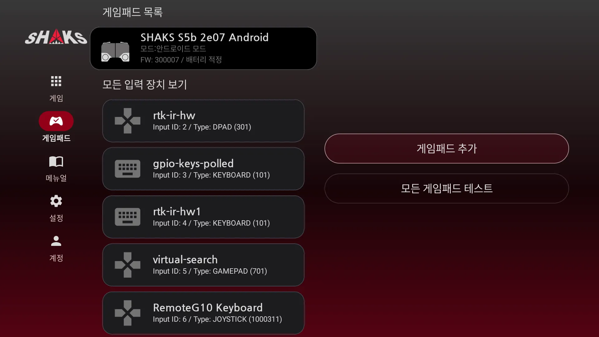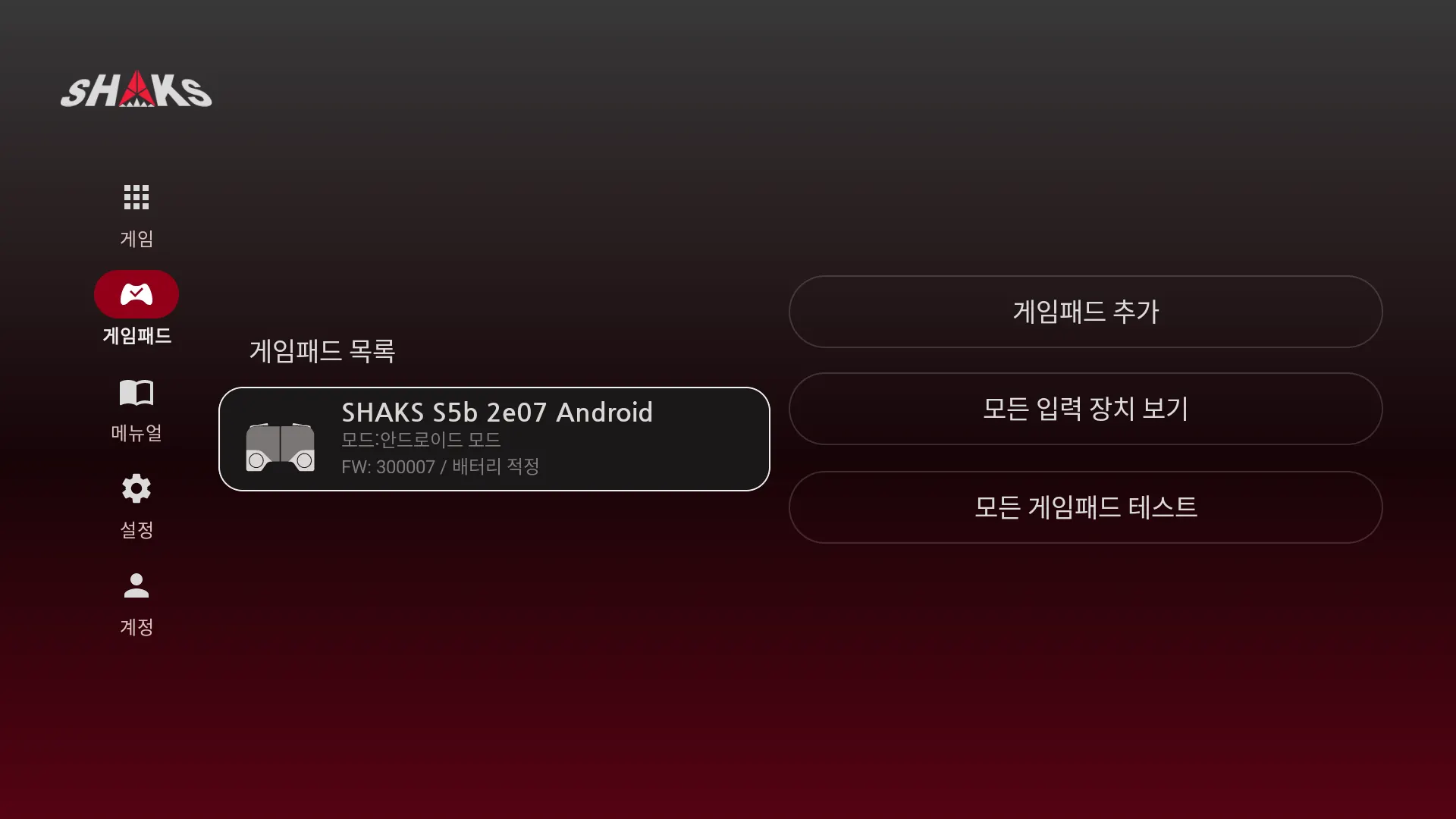 연결된 게임패드 목록 전체가 보입니다. 최대 4대까지 연결 권장 드립니다. 타사 컨트롤러도 표시되지만, 샥스 어플리케이션과 동작은 되지 않습니다.
