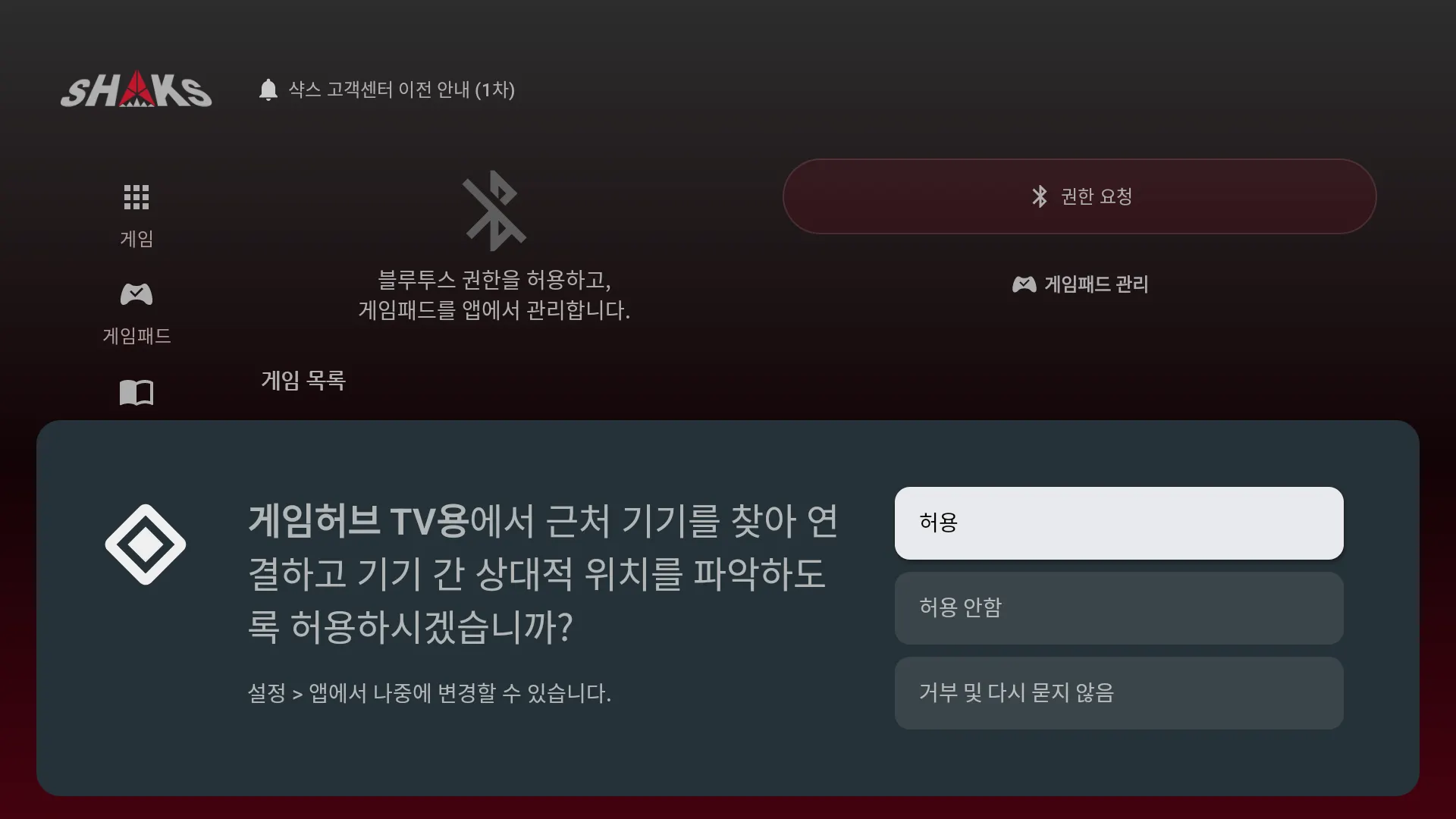 이 앱은 반드시 블루투스 권한이 필요합니다. 저희 제품은 블루투스 기술을 통해 제품을 설정할 수 있습니다. Android 12 에서는 반드시 블루투스 권한이 필요하며, 이를 허용하지 않을 경우 샥스 게임허브 앱의 대부분의 기능을 사용하시기 어렵습니다.