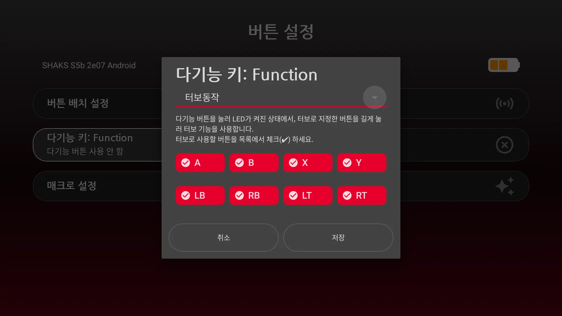 Function 버튼을 눌러 LED가 켜지면 적용되며, 지정한 버튼을 길게 누르면 터보 (연속) 동작이 작동합니다.