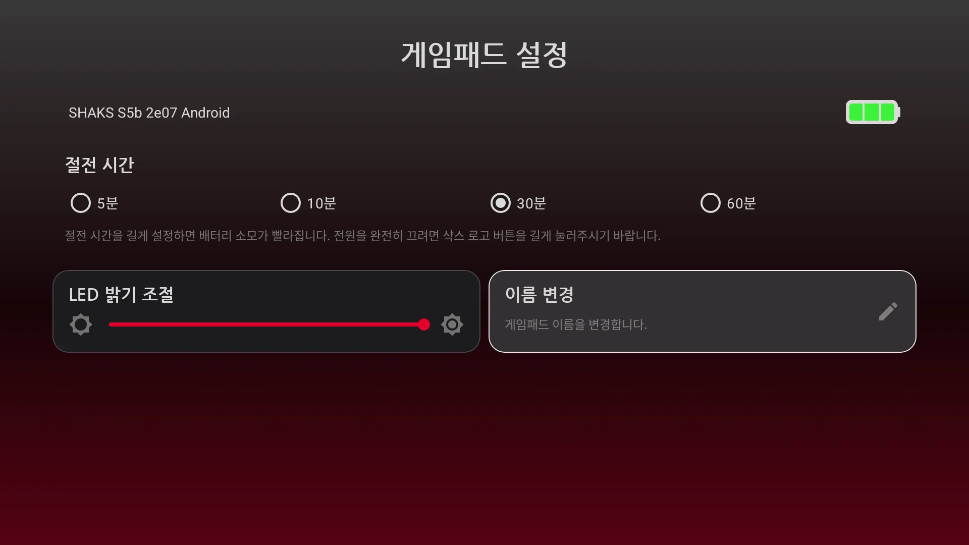 절전 시간, LED 밝기 조정 및 게임패드 이름 변경 등을 하실 수 있습니다.