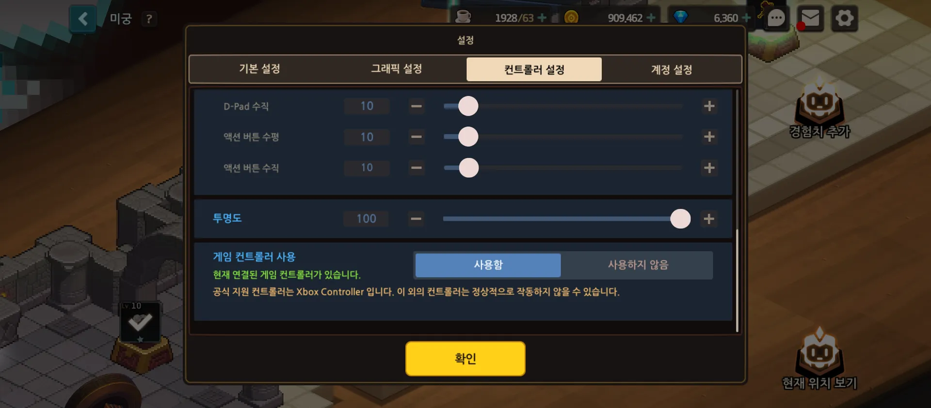 메뉴 이용이나, 인벤토리 화면 등의 상황에서는 사용하기 어려울 수 있습니다. 안타깝지만 게임패드 대신 터치로 직접 조작하시기 바랍니다.