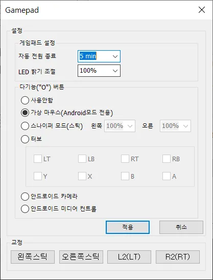 E. SHAKSゲームパッドが正常に接続されたら、アイコンボタンをクリックすると以下のようにゲームパッド設定と多機能“O”ボタンの機能を設定できるウィンドウが表示されます。機能設定後、「Apply」ボタンをクリックして保存します。