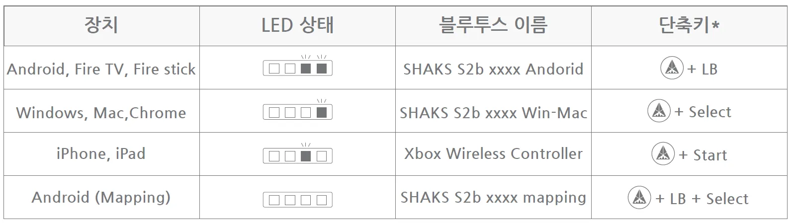 모드 변경은 "Select + LB"버튼 또는 "단축키"를 눌러 수행 할 수 있습니다. 아래 표의 LED 표시를 참조하십시오.
