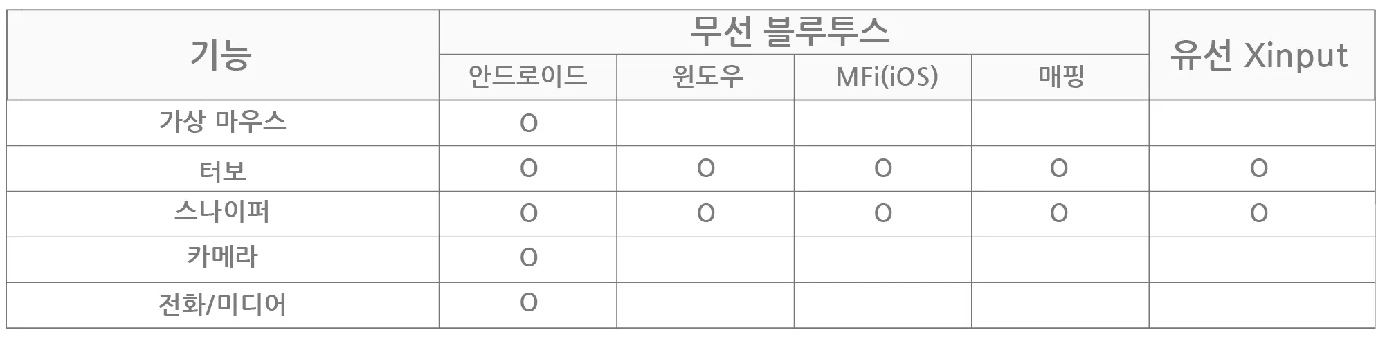 전원 켜기 : 'Power' 버튼을 3 초 동안 누릅니다. 'Power' 버튼을 눌러 게임 패드를 켜면 기본값은 Android 모드입니다. 위의 표에 따라 모드를 변경하십시오. 연결하려는 장치에 따라 2 단계를 따르십시오. 초기 설정이 완료되면 게임 패드가 자동으로 연결되도록 장치를 기억합니다.
