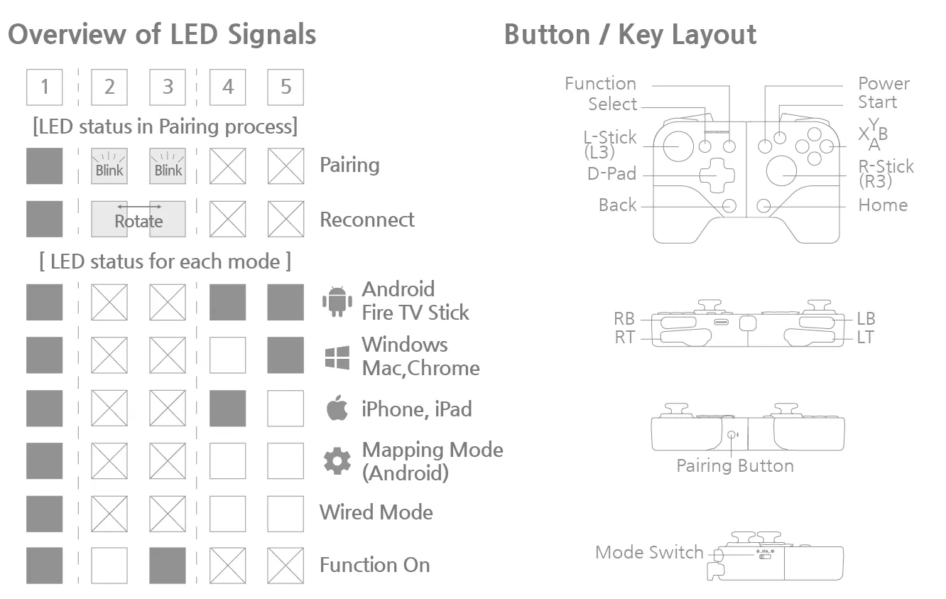 Connecting: Power off, then keep pressing ‘Pairing Button’, then connect to the host device using a USB cable (Sequence Important - 1st pressing and then power connect). The host device will detect the gamepad automatically.
