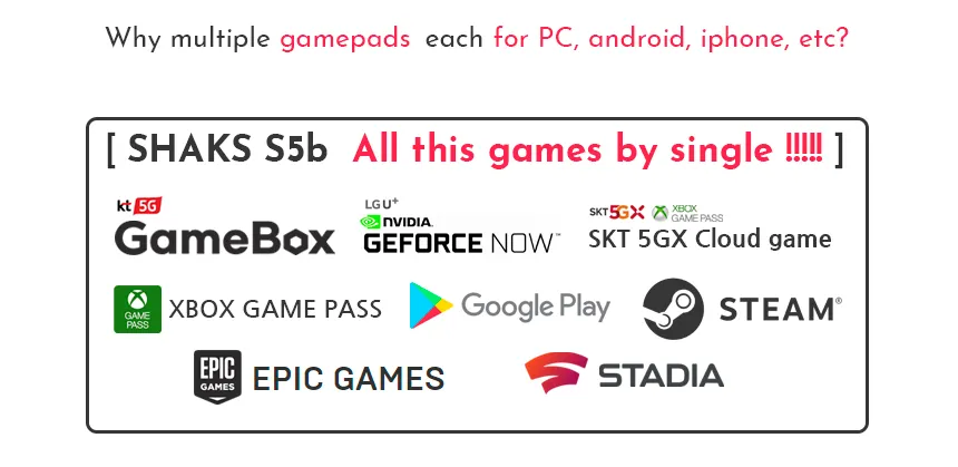 S5 is an Android, iOS portable mobile game controller for "on-the-go" gaming play, but it supports also Windows PC, Notebook, Mac PC, Chromebook, Apple TV, and Android TV box.