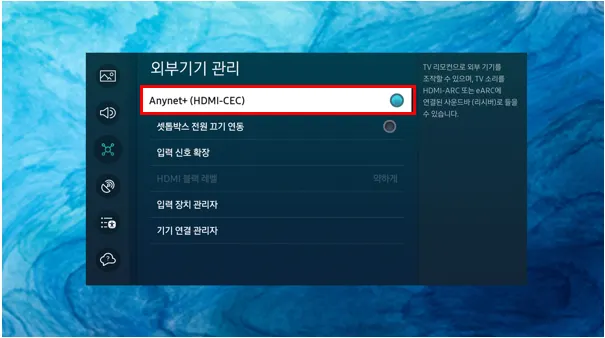 사용하시는 각 TV마다 HDMI-CEC 기능을 정상적으로 지원하고 있는지 확인하십시오.