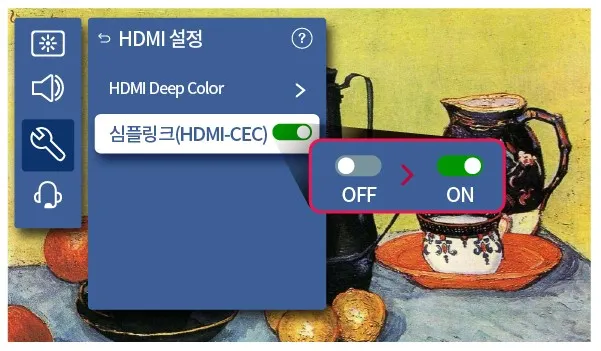 TV를 끄거나 켤 때 HDMI 단자로 연결한 거의 모든 기기들의 전원도 동시에 끄거나 켤 수 있습니다. 따라서, 전원 설정을 하셨을 때는 기능이 기대한 것과 잘 동작하는지, 어느 제품의 전원을 어떻게 설정할 것인지 꼭 사전에 충분히 확인하시고 사용하시기 바랍니다.