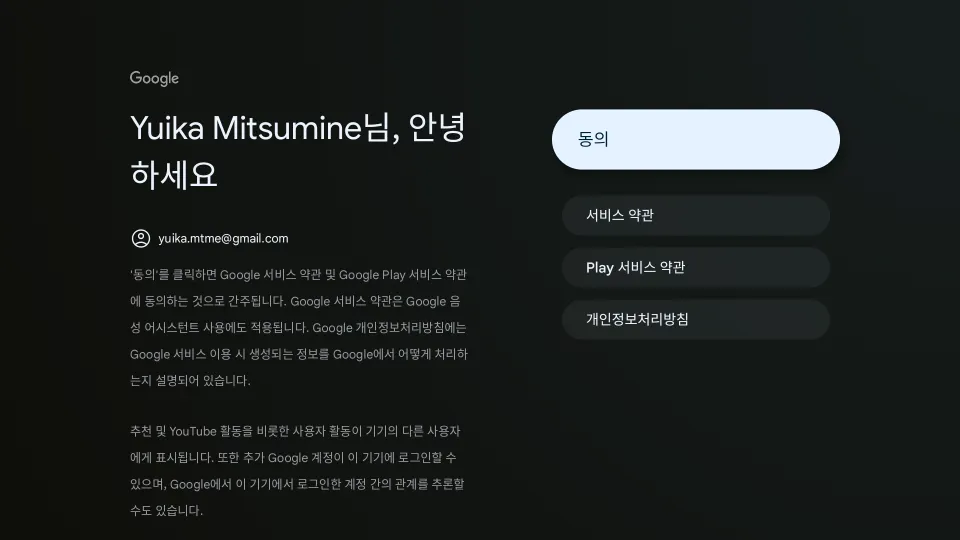 TV화면 왼쪽 상단의 “Google9999” (숫자는 랜덤) 부분이 스마트폰에 표시된 기기와 일치한지 확인 후 다음을 진행합니다.