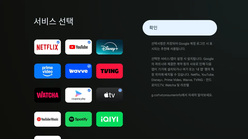 필요한 서비스를 선택하고 ‘확인’ 을 누릅니다.